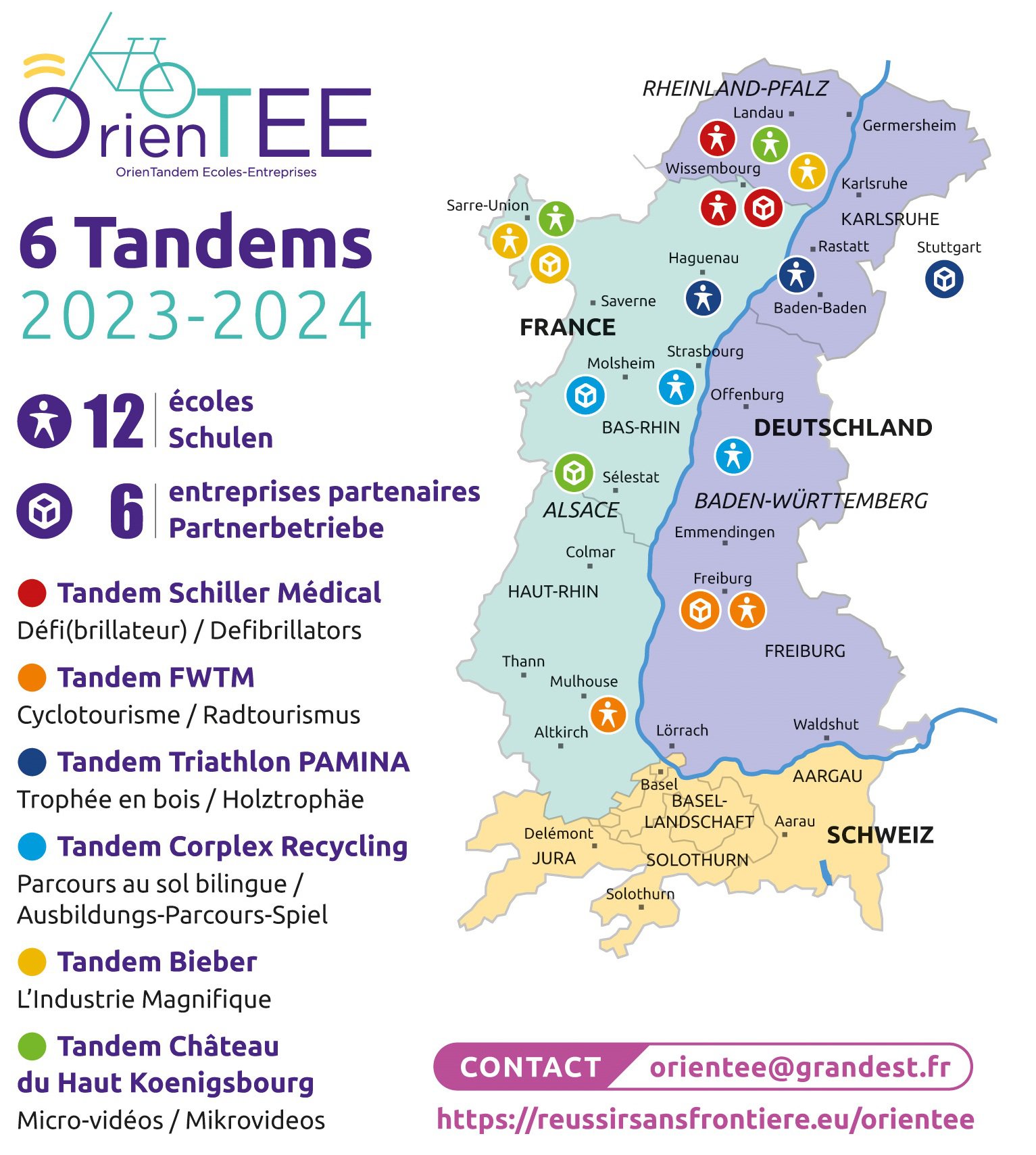 CONTEXTES'appuyant sur l'expérience des relations Ecole-Entreprise développée par le centre TheoPrax situé au Fraunhofer Institut ICT de Pfinztal et de l'expérimentation transfrontalière lors du micro-projet INTERREG TePraTa (Théorie et Pratique en Tandem) sur l'espace PAMINA, le projet Interreg Rhin supérieur OrienTEE: OrienTandem Ecole-Entreprise porté par la Région Grand Est et ses partenaires se propose de développer des actions expérientielles d'information sur les métiers au sein de 44 établissements scolaires (FR-D-CH) en partenariat avec 22 entreprises du Rhin supérieur et ceci grâce au concours des fonds communautaires. Dans un contexte de profonde mutation des conditions d'information sur les métiers et les formations du public scolaire, le projet développe ainsi de nouvelles opportunités pour les équipes pédagogiques afin de leur donner des clés d'entrée pour une connaissance actuelle des métiers et des entreprises servant de levier à une future insertion réussie des élèves sur le marché de l'emploi. |